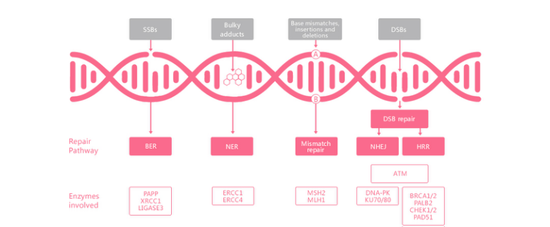 ATM, ATR, BARD1, BLM, BRCA1,BRCA2, BRIP1, CHEK2, MRE11A, NBN, PALB2, RAD51C, RAD51D, RBBP8, SLX4, XRCC2